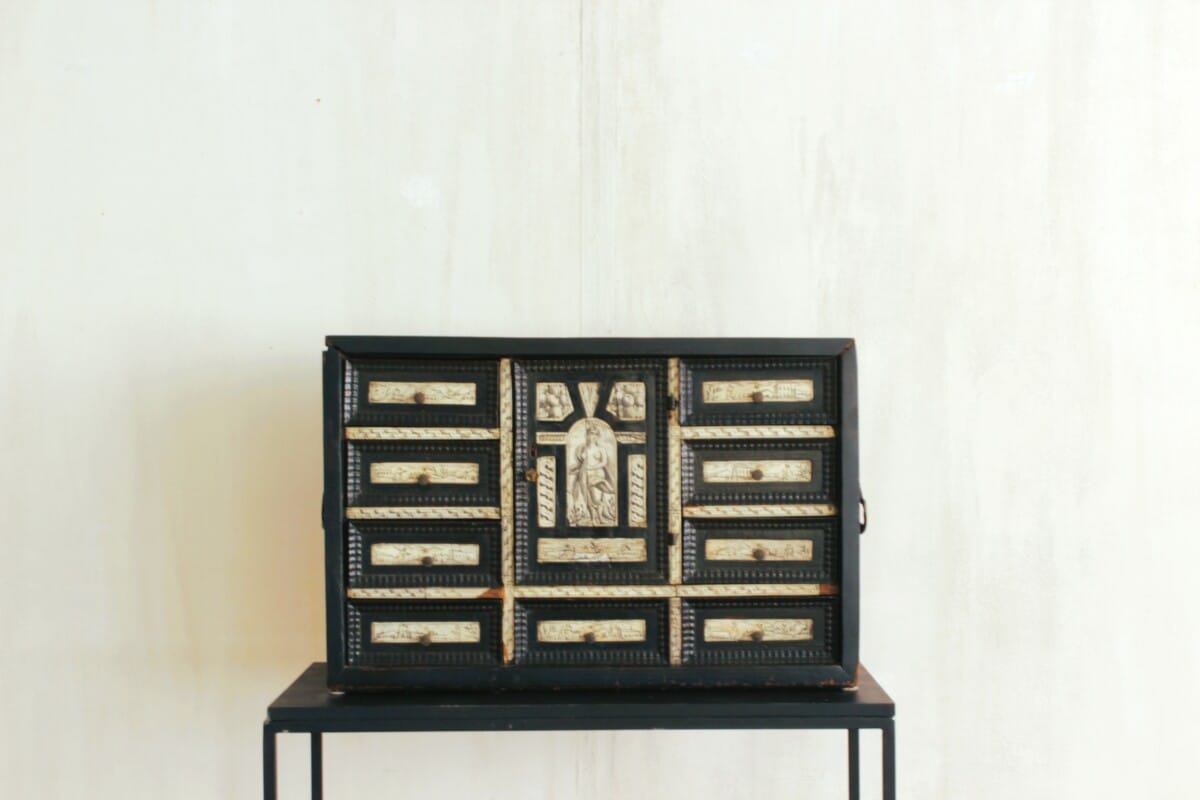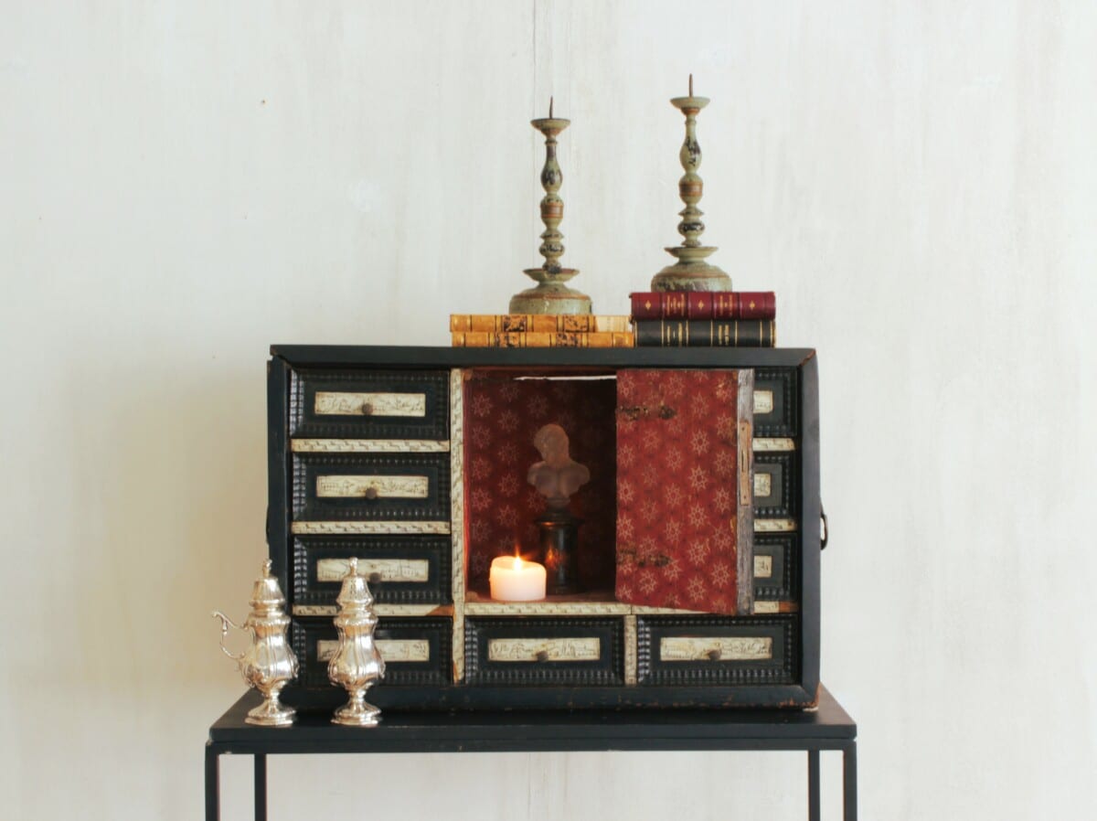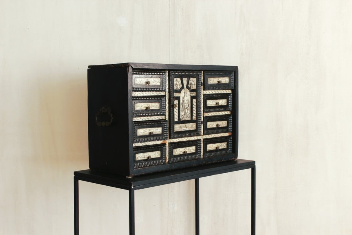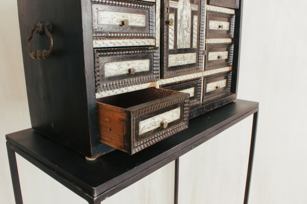 Baroque cabinet Reference: 849C Height: 44 cm Width: 66 cm Depth: 26 cm Baroque cabinet, blackened wood and bone, 17th century, Italy Previous Object Wooden box Next Object Folk art chair Get in touch Pour toute information complémentaire, n'hésitez pas à nous envoyer un mail à cette adresse e-mail : simindg@hotmail.com Δ